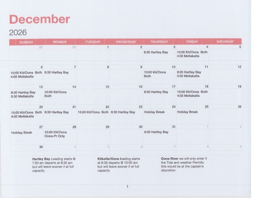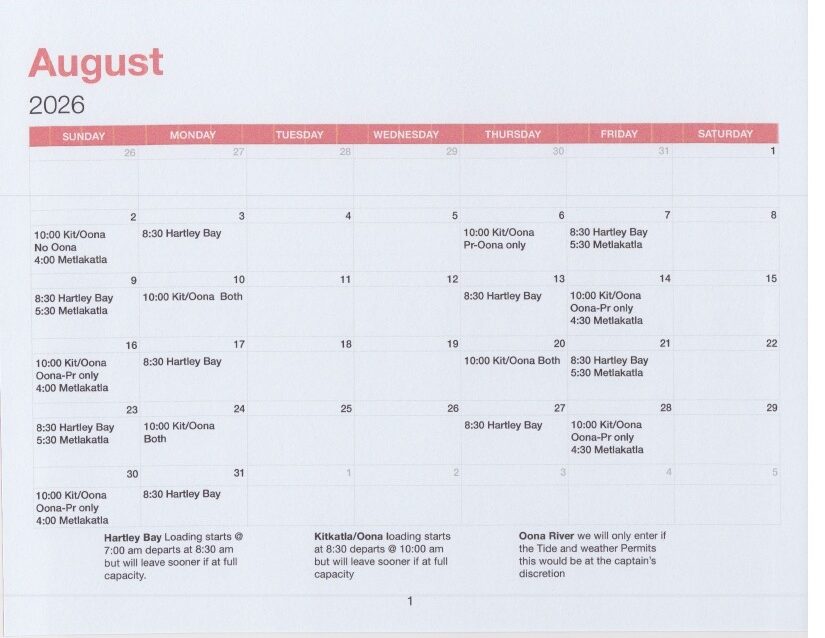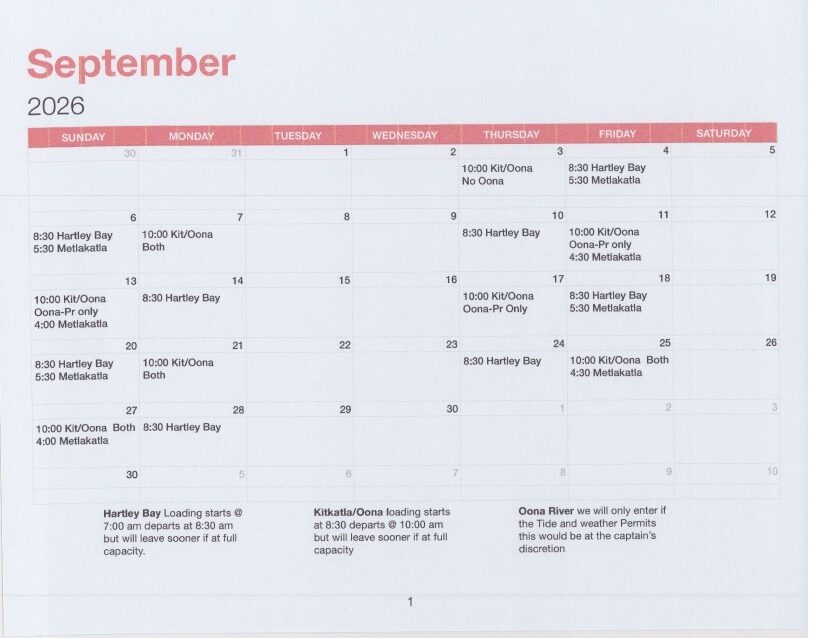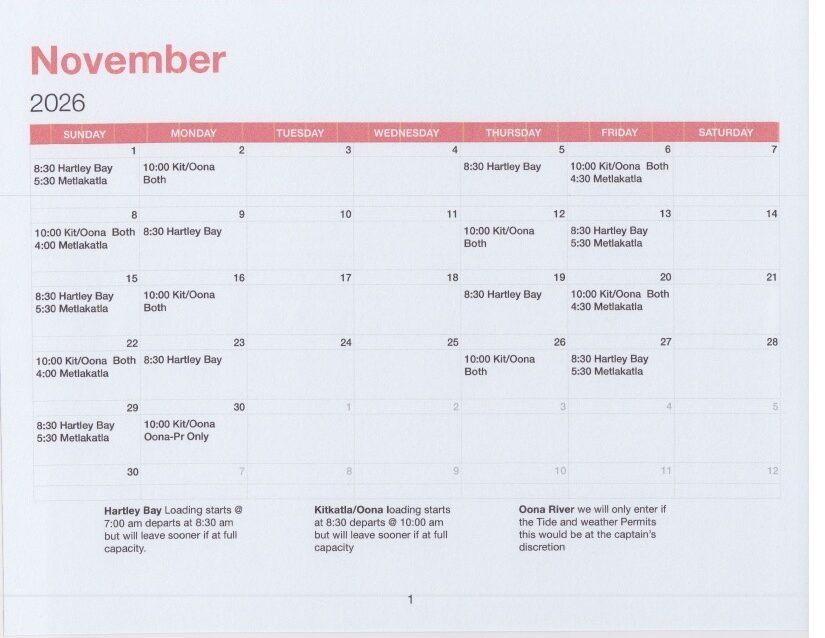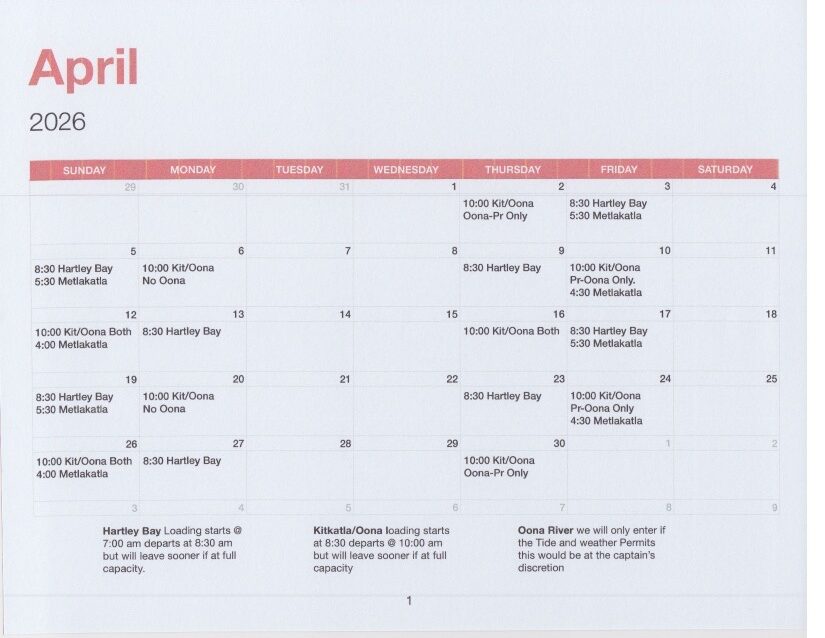 The Tsimshian Storm departs from the Metlakatla Ferry Dock in Prince Rupert twice a week at 10 am. The Return trip departs Kitkatla 12 noon. Timing can be weather dependant. Calendar shows monthly schedule.